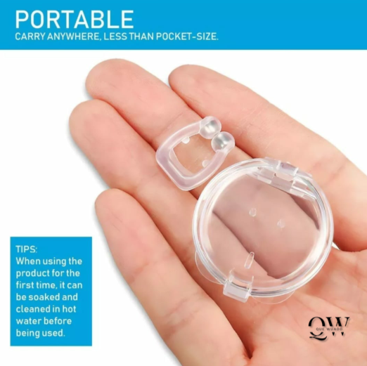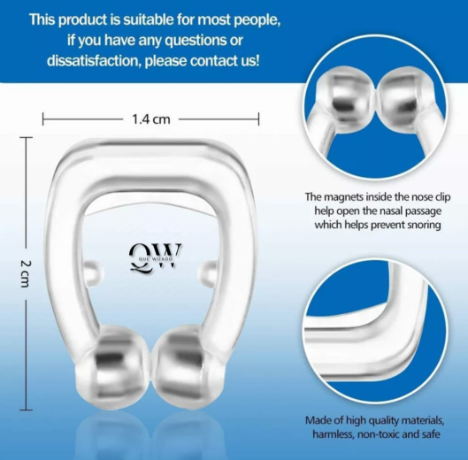 -SOMOS TIENDA ONLINE QUE WUAOO- CLIP ANTIRONQUDOS MAGNETICO DESCRIPCION: Este dispositivo es un dilatador nasal magnético antirronquidos que mejora la respiración compuesta por un clip en silicona y libre de BPA. Se pone en el tabique durante la noche y así regula el aire que inhala y exhala. El efecto de esta presión perdura por toda la noche disminuyendo enormemente el ronquido. No es doloroso, no es incómodo y no lo percibirás durante su uso. CARACTERÍSTICAS: 100% nuevo y de alta calidad.Diseño de hendidura para el cabello nasal para evitar que partículas extrañas o no deseadas entren en los pulmones.La forma cónica avanzada hace que se sienta muy cómodo en la nariz.Evita los ronquidos, la Apnea del sueño y la boca seca.Hecho con silicona de grado médico, más duradero.Hecho de material resistente e hipoalergénico que no irrita la piel.Calma sustancialmente los ronquidos durante toda la noche, es pequeño y liviano, apenas se siente en el tabique. RECOMENDACIONES: Colóquelo en el tabique cuando se vaya a disponer a dormir, notará que le permitirá dormir cómodamente.Limpiar con algo húmedo cuando este sucio. ESPECIFICACIONES: Marca: NoseclipColores: Como muestra la imagen (Transparente)Cantidad: 1 unidad.Tamaño: Como se muestra en la foto. (1,4*2cm)Rango de presión: 4-20 cmH2OMaterial: SiliconaDiseño: UEstuche: Si Notas: Por favor, permita un error de 1-3 mm debido a la medición manual.